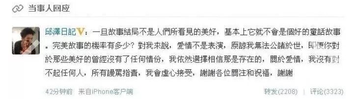 杨丞琳发的分手短信,邱泽等了半个月后才回应。