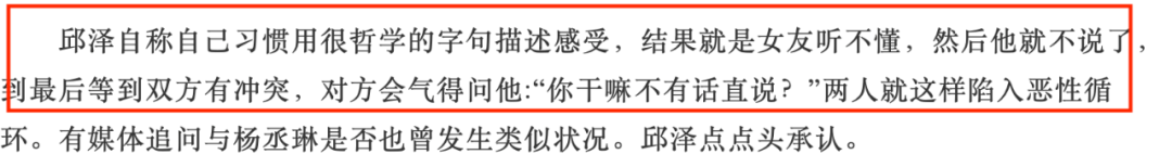 杨丞琳顶多是在康熙匿名抱怨抱怨,后来的一来一去也都是通过媒体公开喊话,虽然分得难看,但分得干净。非常符合邱泽这种直线对外的脑回路。