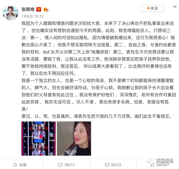 Excuse me?如此荒诞的剧情,张姐肯定不会坐以待毙。前夫微博刚发完一个多小时,她就在自己的微博上扔出了洋洋洒洒写的一大篇回应。