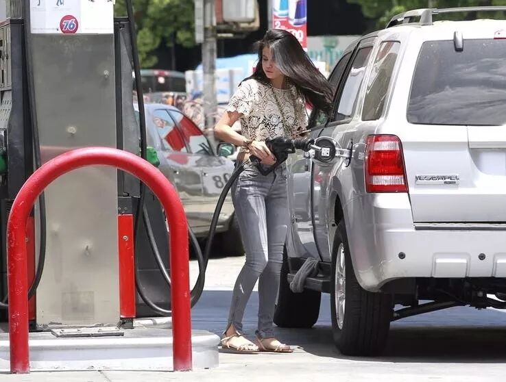 Selena Gomez一手拿着手机,另一手拿着气泵,掌握了填充艺术。她停下了加油站,以便在她的福特逃生中回到路上。她是一位多才多艺的艺术家,曾经在电影,录制专辑,甚至在路上巡回演出。根据Gomez于2012年在加利福尼亚州Encino的一家加油站工作,她不仅在车上装满汽油,而且还清理了挡风玻璃。