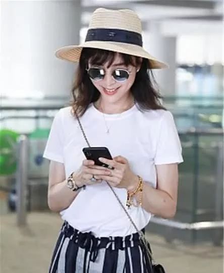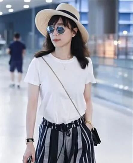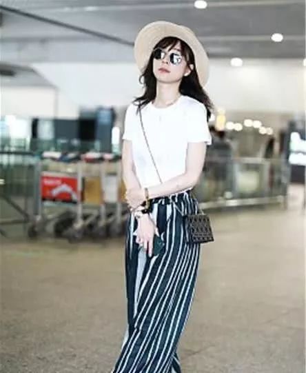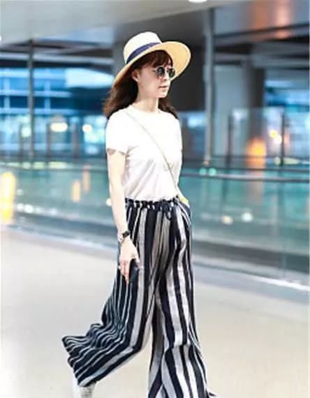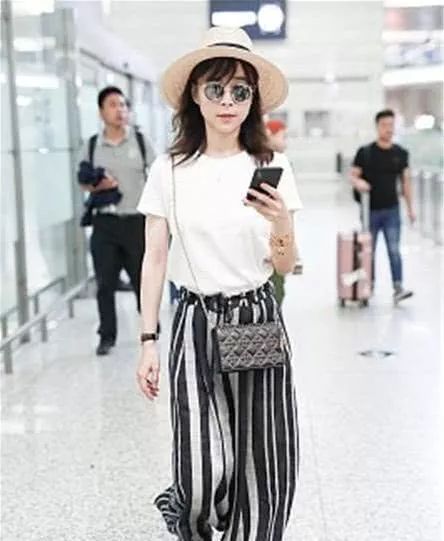 张静初街拍,白T恤搭配黑白条纹阔腿裤Dior圆钉包文艺范儿。
