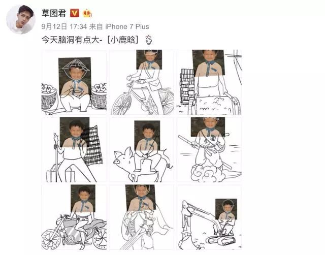 9月12日,有瓜众在微博中贴图,晒出了自己将鹿晗童年旧照各种PS的样式,相片中的儿时鹿晗就形态各异被拼成了九宫图。