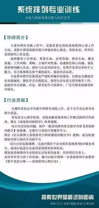 系统排列在中国发展已经十四年,国内众多排列工作组和团体在各自领域开展研究和服务工作,国内积累大批喜爱系统排列的爱好者。本着传播知识,专业辅导,服务大众的初衷,王睿老师,在2016年开展为期一年的系统排列专业教学工作,培养500位掌握系统排列专业知识的学员,指导50位具有实践能力的一线系统排列工作人员,对学员中的优秀人员重点辅导,以期成为国内优秀排列师。