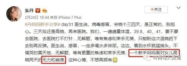 同样是湖南卫视(前)主持人,朱丹也在2月24日发了一条微博,可是她的画风就完全不一样,因为她的女儿高烧不退,让朱丹这样的一个新手妈妈束手无策。