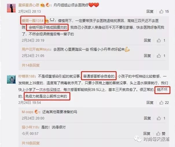 网友纷纷给朱丹支招,可是她们的看法截然相反:有的说赶紧送医院,会烧坏脑子,烧成脑膜炎;还有的说普通感冒会自愈的,烧不坏的,孩子的免疫力就是这么锻炼出来的。