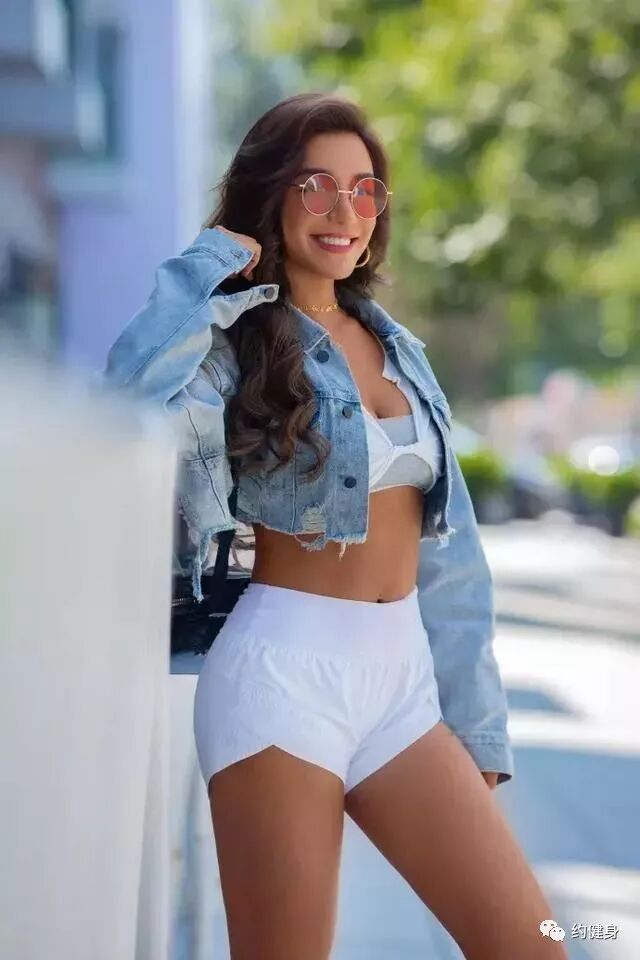 一身运动短打,套上半长牛仔外套,再配上小麦皮肤和健美身材,乍一看还以为是哪个欧美健身网红呢?非常好看。