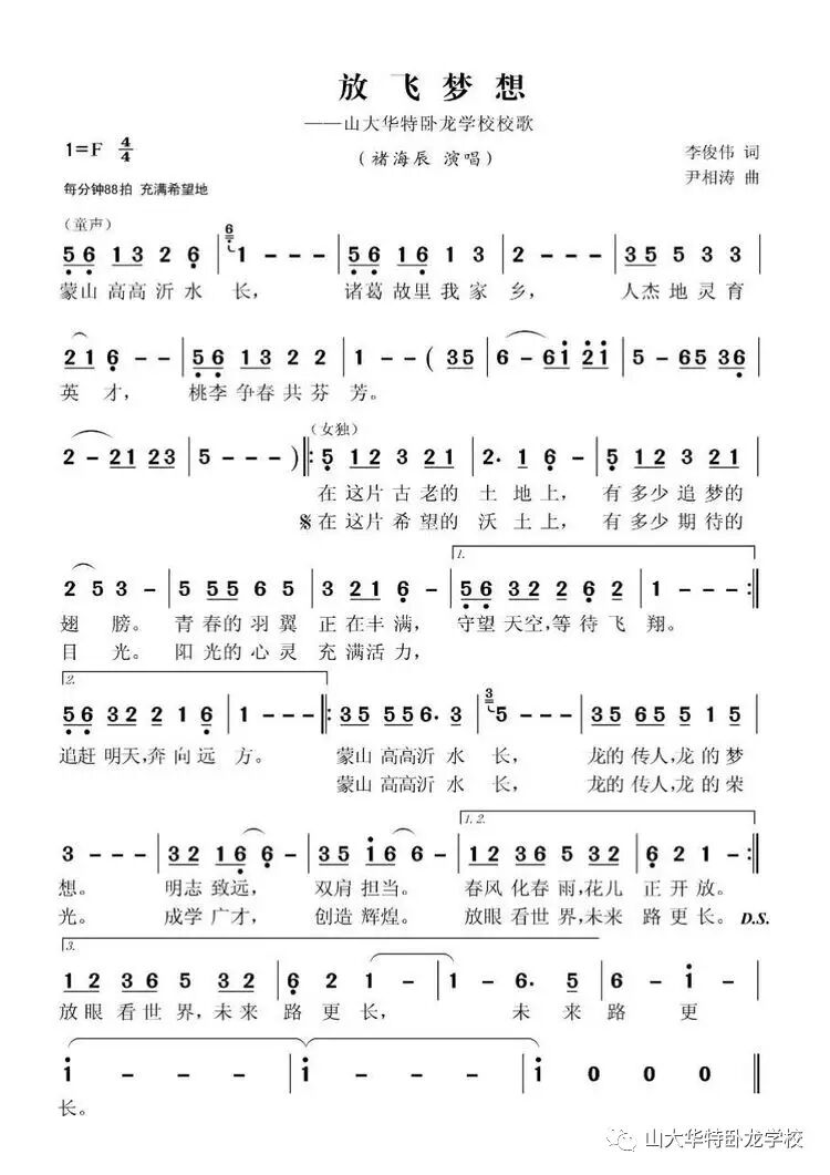 “明志致远,双肩担当;成学广才,创造辉煌。” 字里行间透着自信自强与自豪,字字铿锵有力,句句掷地有声。“青春的羽翼正在丰满,守望天空等待飞翔。” 为了那些期待的目光,大鹏就要抟摇直上。“放眼看世界,未来路更长。” 只有梦想还是远远不够的,还要放眼世界,展望未来。少年心事当拏云,卧龙学子要胸怀天下,志存高远,用坚强做翅膀,把希望化成力量,梦想才会闪光。《放飞梦想》充分体现了学校的办学理念,指明了师生共同奋进的方向,表达了卧龙人的情怀与担当,唱出了精气神,唱出了卧龙魂。