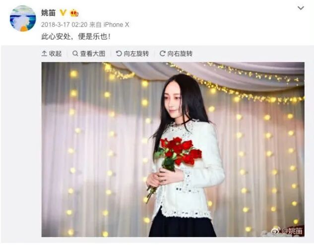 照片里的她握着成束的红玫瑰浅笑盈盈,并配了字: