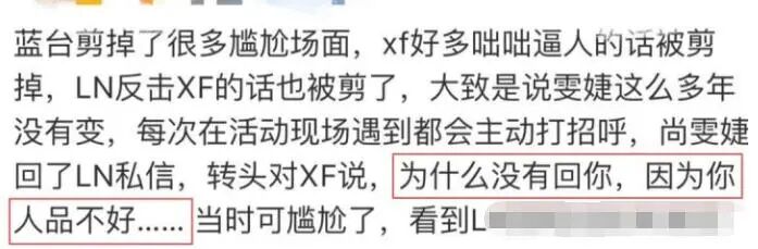 当然,为了能够保证节目顺利播出,到底剪掉了多少火药味十足的画面和对白,恐怕没有多少人知道。但是据现场工作人员爆料称,许飞还说了很多咄咄逼人的话,全都在针对尚雯婕,丝毫没有给对方留足情面。