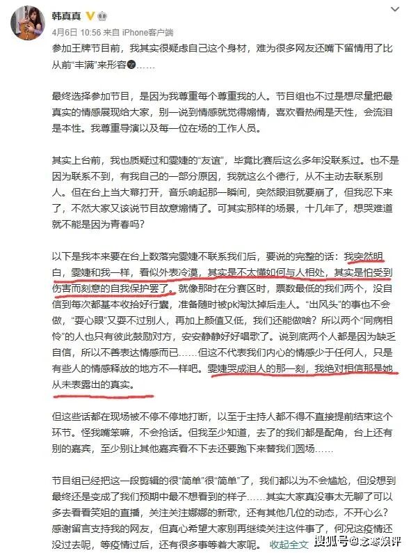 除此之外,韩真真也站了出来替尚雯婕发声,虽然没有在节目里头反驳许飞的言论,但从她微博长文当中,可以感受到她对尚雯婕的印象是非常不错的。