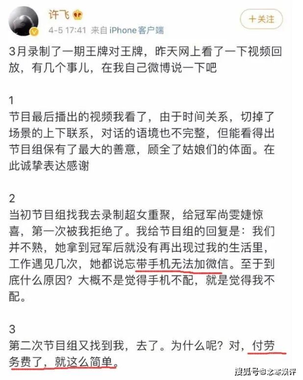 至于为何不喜欢尚雯婕,还要去录与对方重聚的节目,许飞很直截了当,为了劳务费,做了自己不愿意做的事,讲白了就是为金钱低头了。