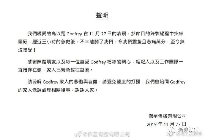 《追我吧》节目组声明表示,高以翔当时被送进医院后,经过两个多小时的抢救,最终被宣布心源性猝死。