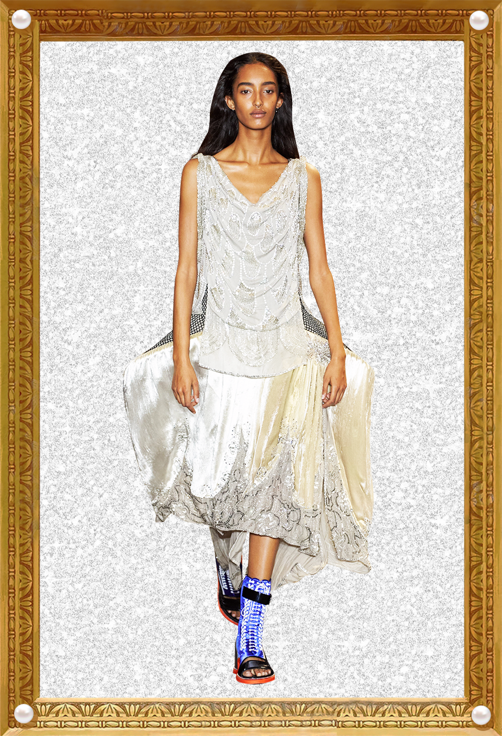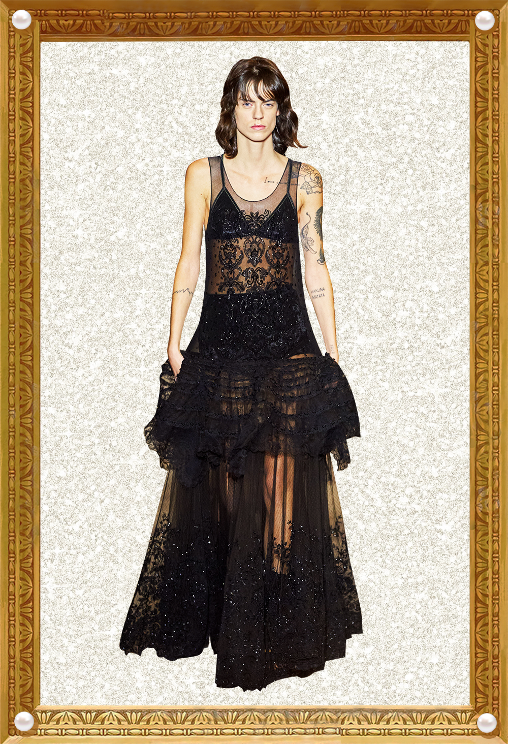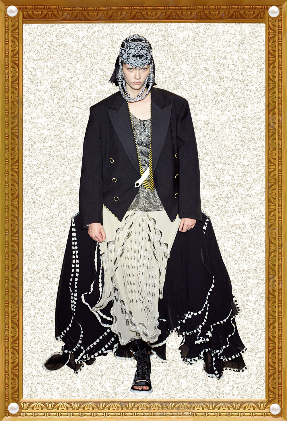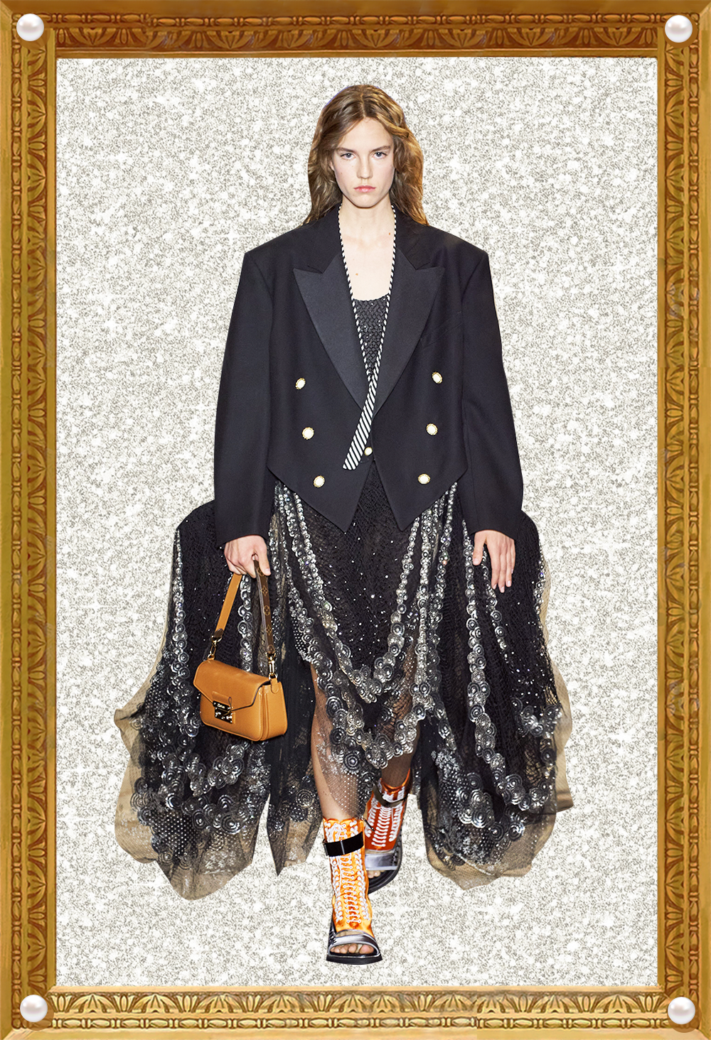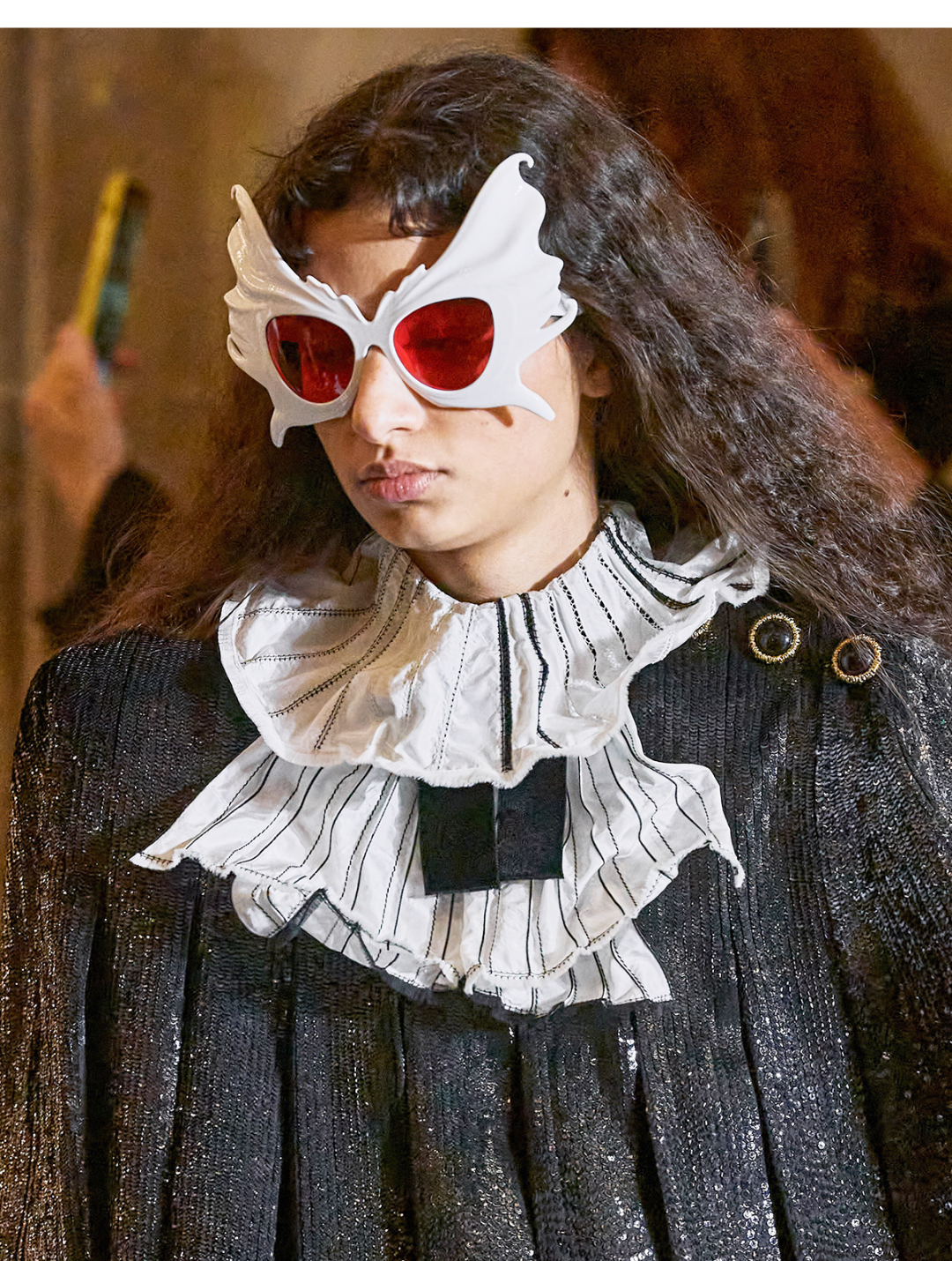 我感觉Nicolas本人特别看重这活。他直接用《迷离劫》中的吸血鬼形象作为LV的2022年春夏女装系列的灵感,所以看这个秀,多少能看到点剧里女主角的风格了哦?