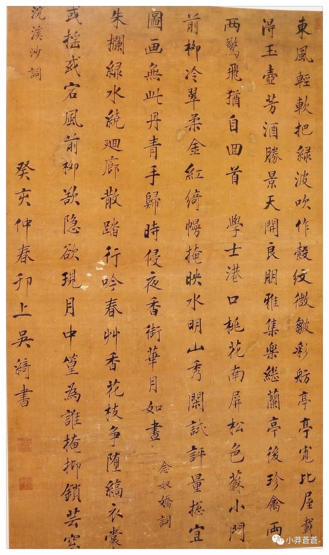 释文: 东风轻软,把绿波、吹作谷纹微皱。彩舫亭亭宽比屋,载得玉壶芳酒。胜景天开,良朋雅集,乐继兰亭后。珍禽两惊飞,犹自回首。 学士港口桃花,南屏松色,苏小门前柳。冷翠柔金,红绮幔掩,映水明山秀。闲试评量,搃宜图画,无比丹青手。归时侵夜,香街华月如昼。念奴娇词。 朱栏绿水绕回廊,散踏行吟春草香,花枝争堕缟衣裳。或摇或宕风前柳,欲隐欲现月中篁,为谁掩抑锁芸窗。浣溪沙词。癸亥仲春邗上吴绮书。