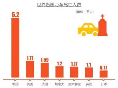 资料显示:日本的万车死亡率是0.77,英国是1.1,加拿大是1.2,澳大利亚是1.17,法国是1.59,美国是1.77,而我国为6.2,是发达国家的4至8倍。