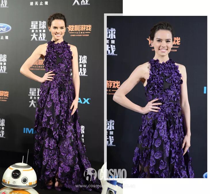 《星球大战》伦敦首映礼中,Daisy穿上了与电影角色,性格十分相近的酷炫的黑色。与之前比较,Daisy确实是丰满了不少,这可能是传说中的幸福胖吧。
