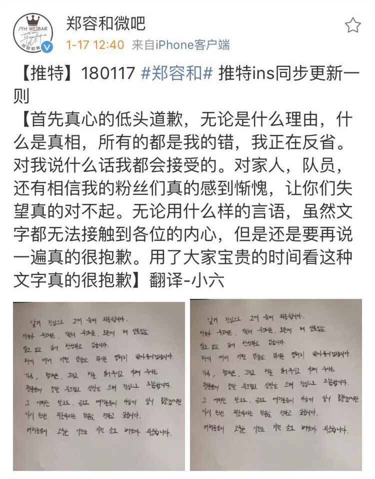 接着,郑容和也马上在INS上发了亲手写的道歉信↓