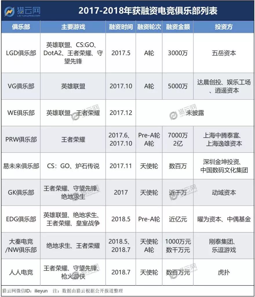 在电竞俱乐部方面,去年,VG战队相继完成近千万人民币的Pre-A轮融资与5000万的A轮融资,LGD战队获得了3000万A轮融资,电竞战队常奥RW宣布获得千万元Pre-A轮融资。