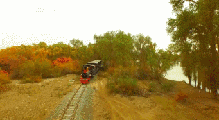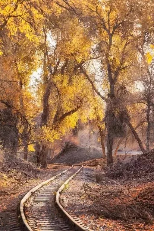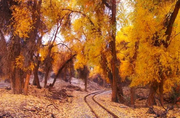 深秋时节,坐上观光小火车,铁路两旁尽是金色胡杨,仿佛坐上了一列开往童话世界的列车。