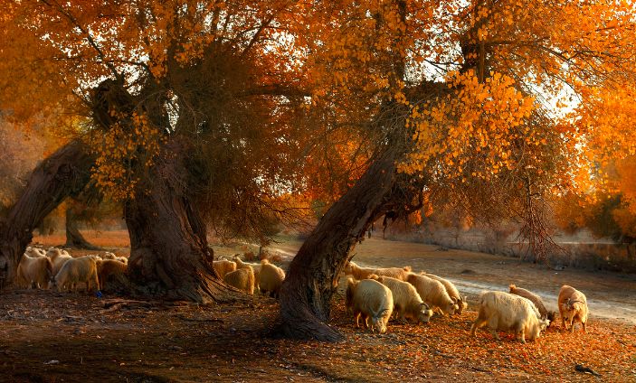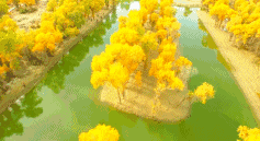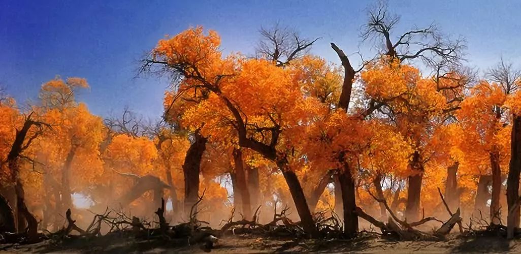 在短短的几天之内,秋风会将绿色的胡杨叶,全部染成金黄,在湛蓝的天空下和苍茫的沙漠中,宛如阳光一般明媚灿烂;而当寒风乍起,一树的绚烂又落成满地金黄。