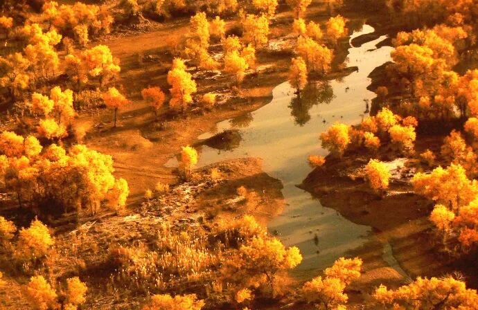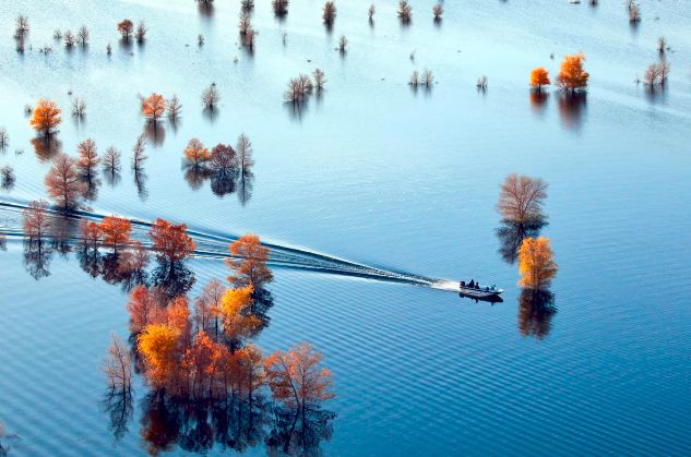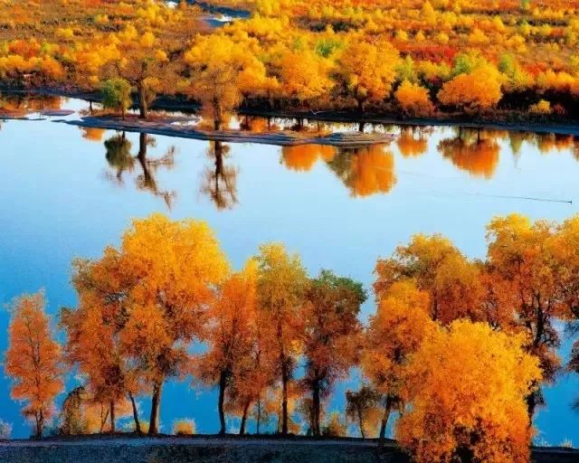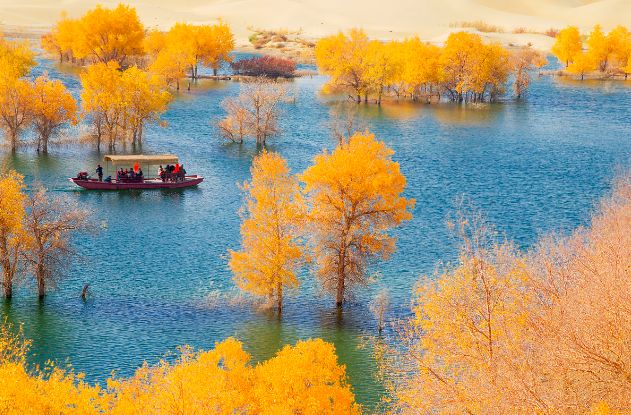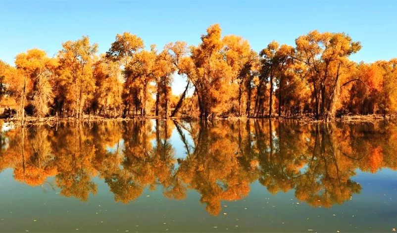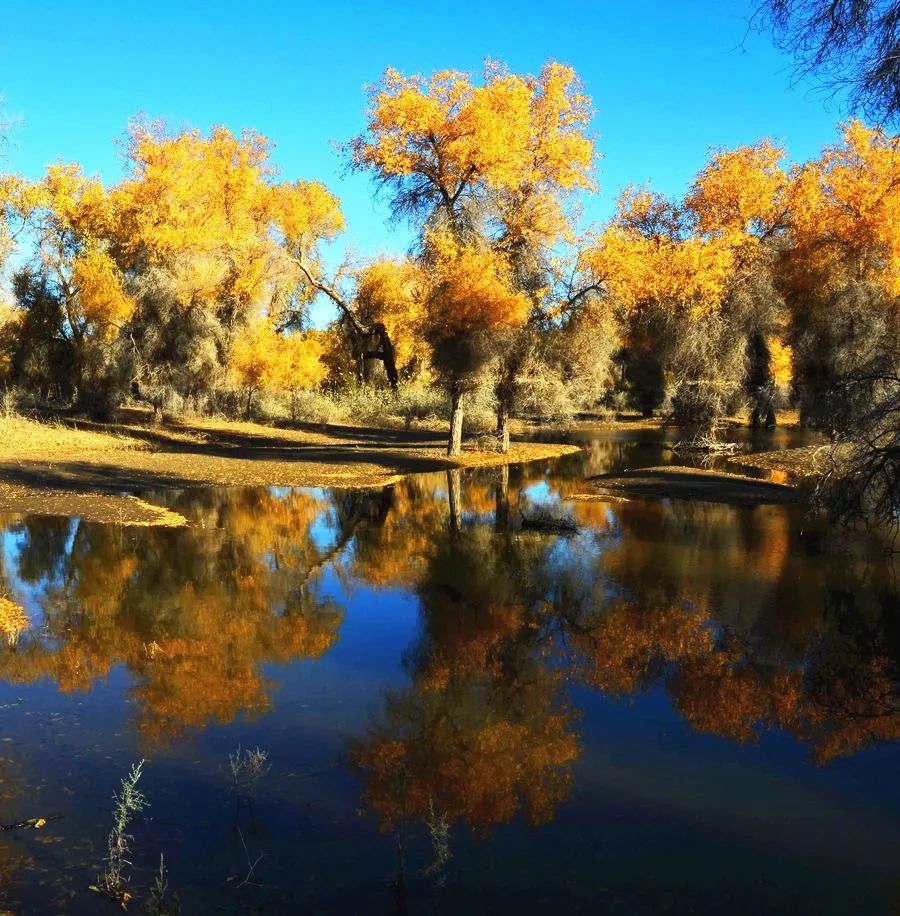 深秋时节,澄澈的水中,屹立着金与红的胡杨树,乘舟从水面上划过,仿佛划过了一个色彩斑斓的秋梦。