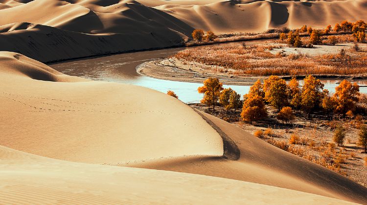额济纳的胡杨林,是我国第三大的巴丹吉林沙漠上的绿洲;而塔里木胡杨林,则扎根于我国最大、世界第二大的塔克拉玛干沙漠中;