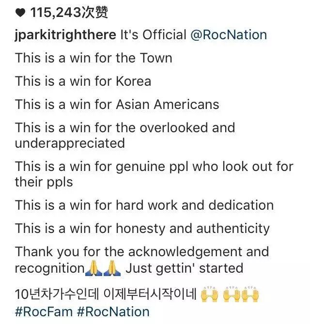 现在朴宰范身兼数职,看他的instagram主页AOMG×H1GHR MUSIC×ROC NATION,大家就应该知道wuli朴社长是有多忙碌!不仅得自己当社长管理旗下艺人的发展,还得考虑自身的发展,Roc Nation就是朴宰范近期以个人身份加盟的国外唱片厂牌。