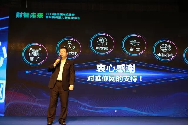 唯你网首席顾问连伟舟开场致辞,他表示唯你网用4年时间,验证了“人工智能+财税”的商业模式的可行性。今天唯你网能拿出“财税界最大A轮融资”的成绩单,非常感谢客户、投资人、合作伙伴、AI科学家、金融机构、政府等各界对唯你网一直以来的信任、关注和支持。