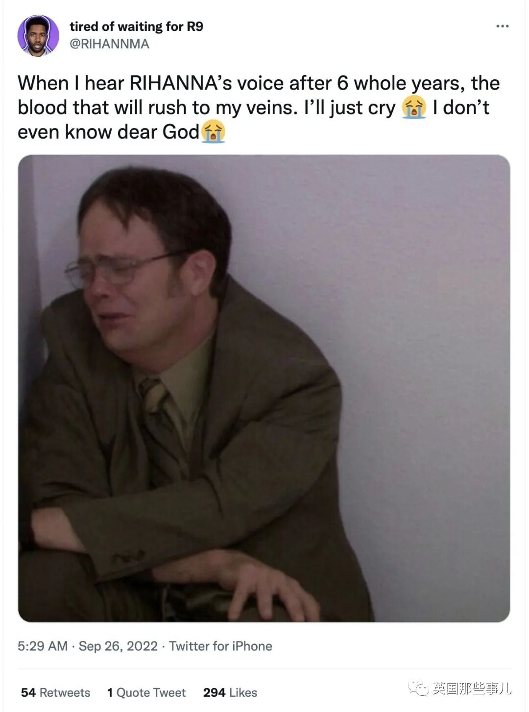 “整整6年后再听到蕾哈娜的声音,我的血液会不停翻涌,我哭个不停,不知道该怎么办了我亲爱的上帝!”