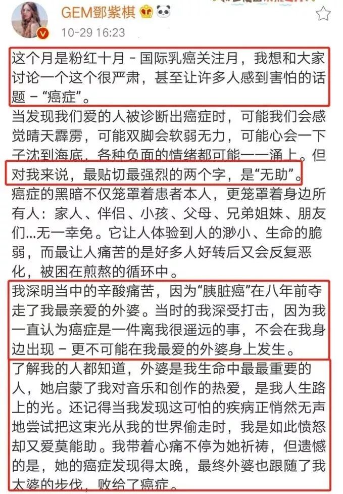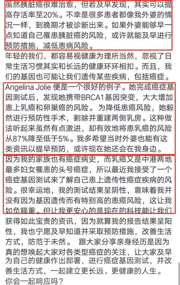 邓紫棋在文中称她最爱的外婆八年前就因“胰脏癌”去世,而邓紫棋的基因检测结果是阴性,意味着没有因为基因遗传而有特别高的患癌风险。但她也呼吁大家及早采取预防措施,进行防癌基因检测,改善生活方式,防范于未然,享受更长远、健康的人生。