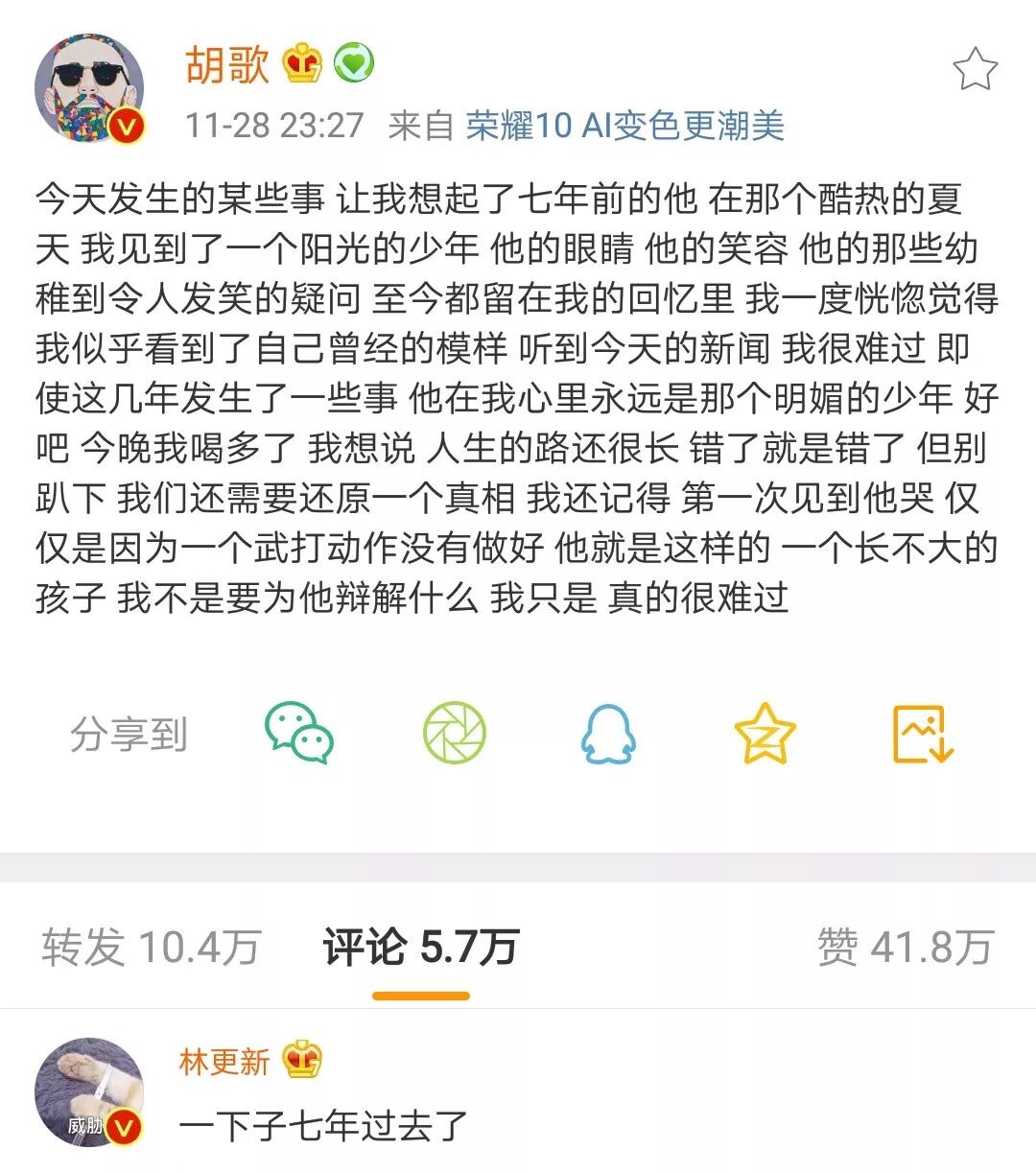昨晚深夜,胡歌发文回忆与蒋劲夫的过往,他称自己得知蒋劲夫的新闻后十分难过,在他心里蒋劲夫一直是那个明媚的少年。但胡歌认为自己不是要为蒋劲夫辩解,只是自己想勉励他,人生的路还很长,虽然做错了,但别趴下。随即多名圈内好友转发感慨,林更新也评论“一下子七年过去了”