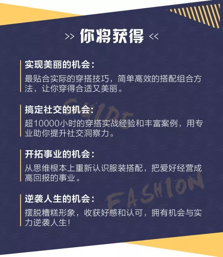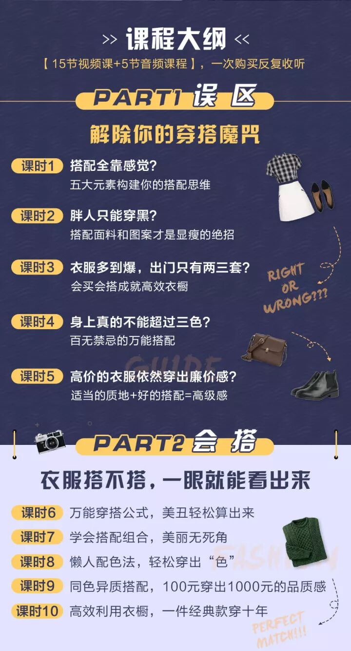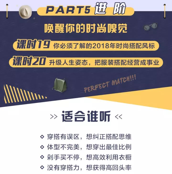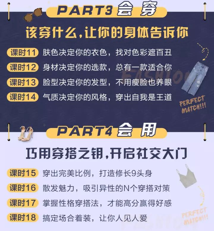 理论知识紧密结合实操,理论占40%,实操增至60%,生动案例分享,趣味性更强!还可免费加入穿搭改造社群,每天获取免费的专业穿搭知识,上万人共同学习进步!