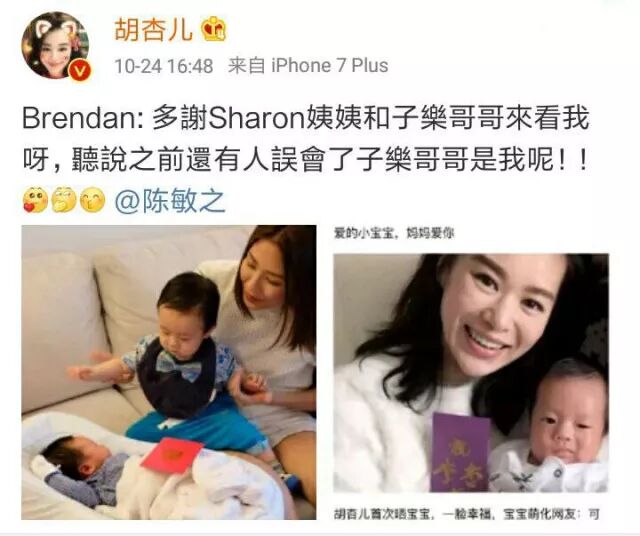 在微博中,她以儿子Brendan的口吻写道:多谢Sharon姨姨和子乐哥哥来看我呀,听说之前还有人误会了子乐哥哥是我呢!