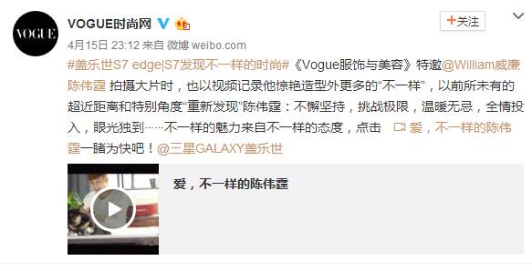 #盖乐世S7 edge|S7发现不一样的时尚#《Vogue服饰与美容》特邀@William威廉陈伟霆 拍摄大片时,也以视频记录他惊艳造型外更多的“不一样”,以前所未有的超近距离和特别角度“重新发现”陈伟霆:不懈坚持,挑战极限,温暖无忌,全情投入,眼光独到⋯⋯不一样的魅力来自不一样的态度,点击 L爱,不一样的陈伟霆一睹为快吧!