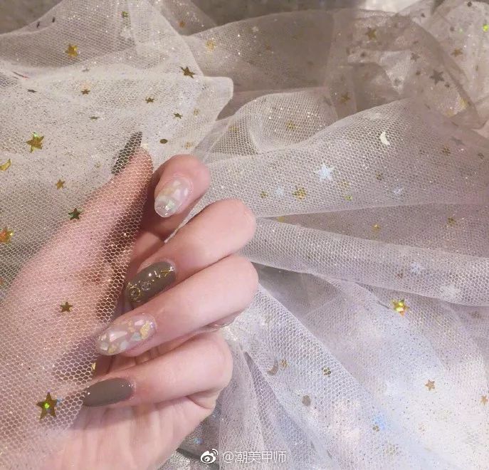 带有贝壳感的花纹美甲,闪闪亮亮的,配上纱裙,你就是梦幻小公举啦~