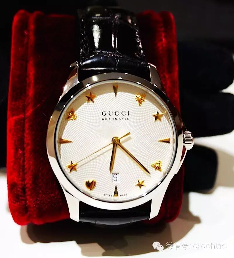 ◥ 乍一看,一枚普普通通的皮表带加简约表盘的腕表,仔细一看,时间刻度的位置会有小星星、小蜜蜂的乱入。明眼人一看就明白,这些小元素都是GUCCI非常标志性的图案,这个小细节的处理,我们给满分!