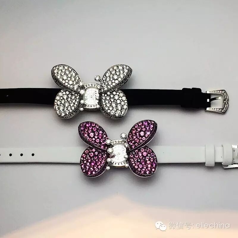◥ 优雅轻盈的蝴蝶一直是格拉夫的灵感泉源,而这枚蝴蝶造型的Princess Butterfly神秘腕表简直就是少女心的最佳代言人,这一只3D的蝴蝶也是抢尽风头。腕表采用创新的开关装置,只要轻轻推开宝石,便能看到17毫米的贝母表盘。