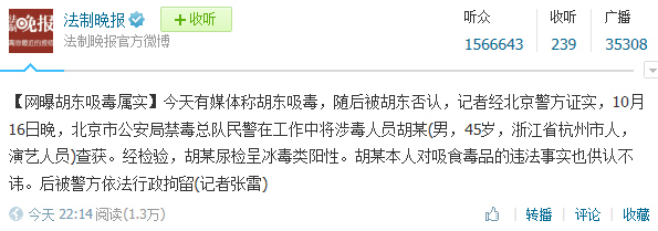 当天晚上十点半左右,胡东吸毒一事突然再起波澜。有媒体称已向北京警方求证,日前确有胡姓男艺人因吸食毒品被抓。随后腾讯娱乐也独家获悉,10月16日晚,北京市公安局禁毒总队民警在工作中将涉毒人员胡某查获。经检验,胡某尿检呈冰毒类阳性。审查中,胡某本人对吸食毒品的违法事实也供认不讳。后该人员因吸食毒品被警方依法行政拘留十五天。根据记者收到的消息,该胡姓男艺人今年45岁,系浙江省杭州市人,与胡东资料基本吻合。