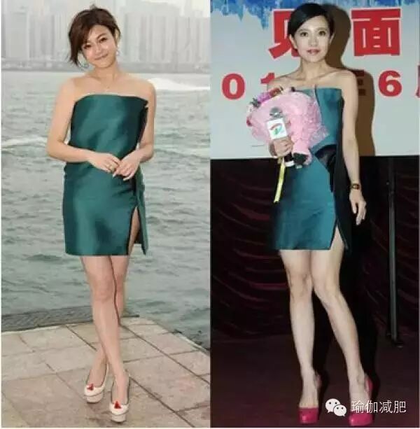 陈妍希和郭采洁都穿了这件深绿色高开叉礼服。身材略胖的陈妍希穿起来身体没有曲线,郭采洁身材纤瘦,驾驭住了这件衣服。