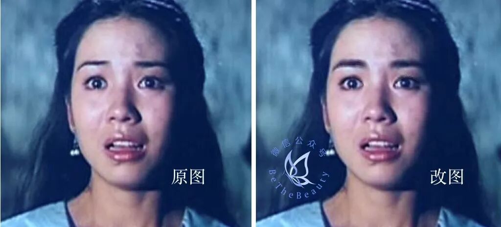 可以看出,右边钟楚红的眉毛更长,眉峰更清晰,整体眉形更「有力」「分明」了,也显得轮廓更清晰。