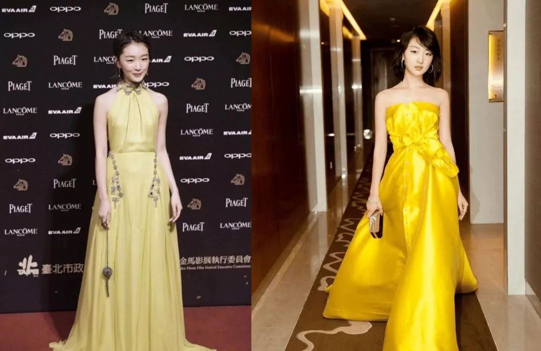 并不是说她们其他风格就不能尝试,我们只是在说一个人风格的核心竞争力的问题,比如周冬雨也不是不能强势(下图右边),但可以看出来,尽管右边通过化妆增加了锐度和气场,勉强Hold住这么明亮的黄色礼服,仍然不如穿左边这种清新一点的黄绿色、走精灵少女的路线更有竞争力,毕竟在左边这种风格的领域,没人能赢过她。