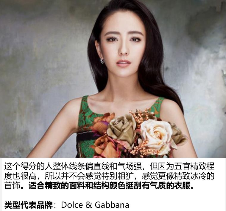 佟丽娅因为脸部几何结构的问题,就适合结构钢硬、面料精致的服装类型,柔软、轻薄或者精致程度不够的就不协调。