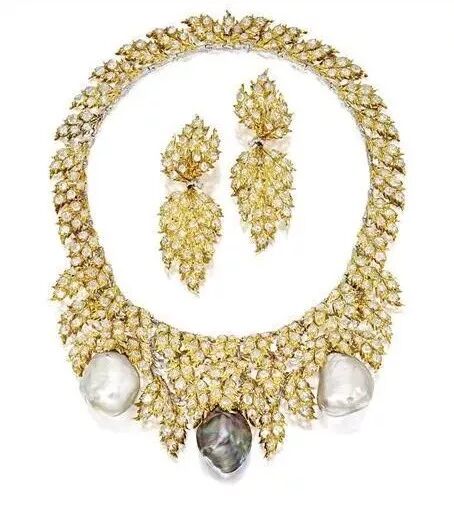 这套首饰以两颗大颗白色异形珍珠和一颗形状相约的灰黑色异形珍珠为主,项链由一片片镶钻的雕金羽毛组成,高雅之余平添几分妩媚。