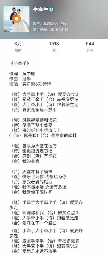 刘诗诗和吴奇隆因戏结缘,一路走来,二人之间的感情正如《手牵手》的歌词中所写:大手牵小手,爱就是永远不放手。