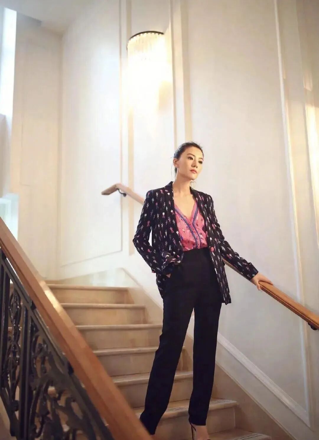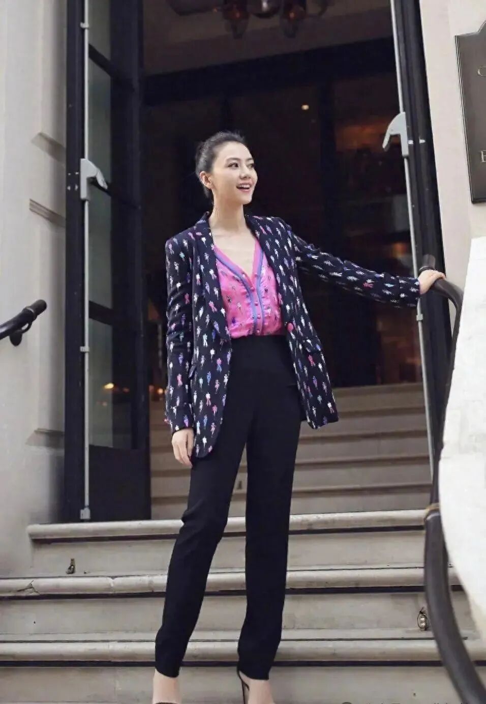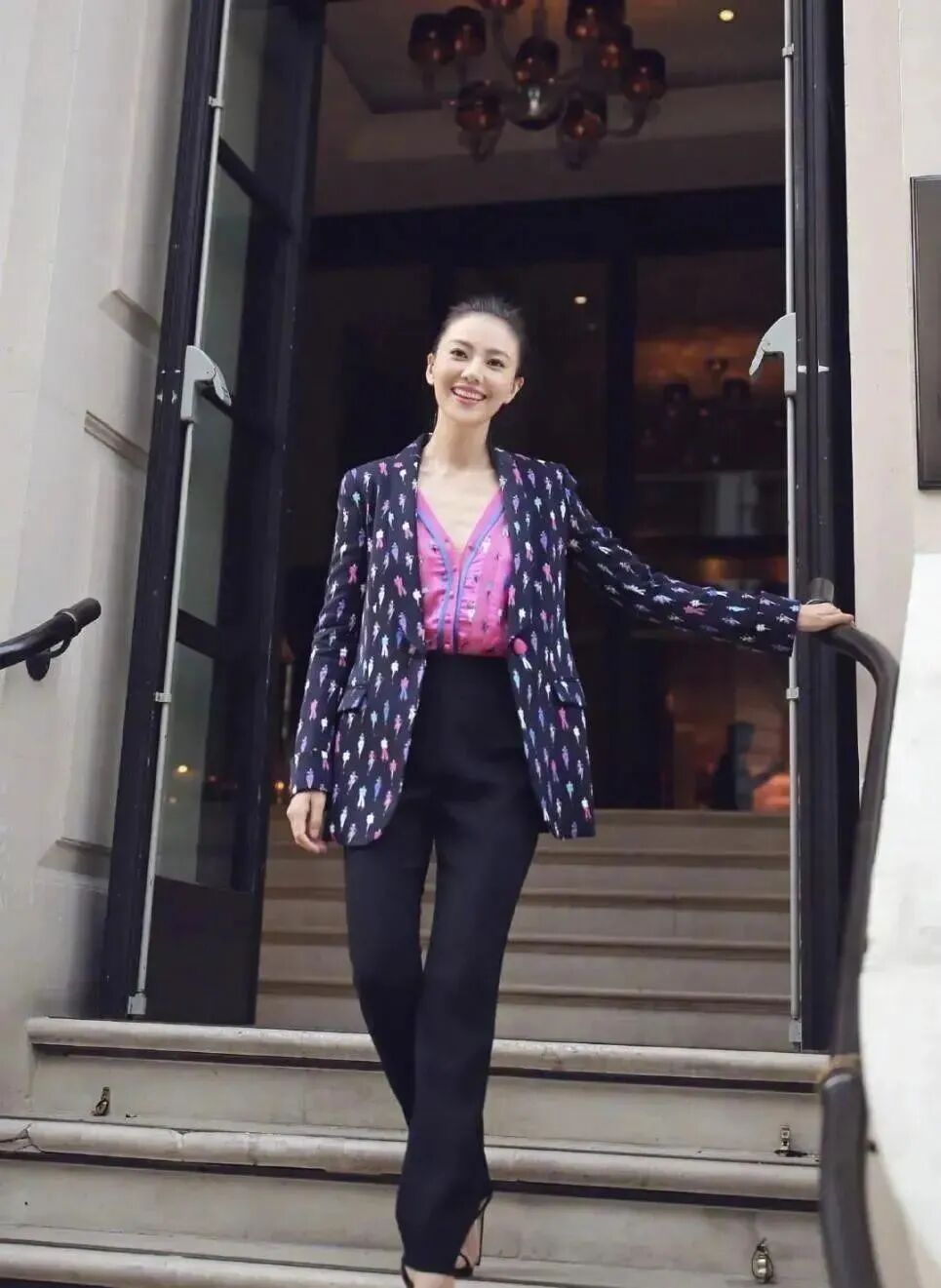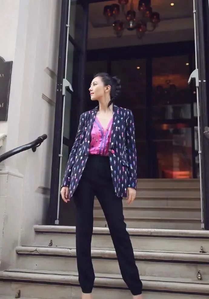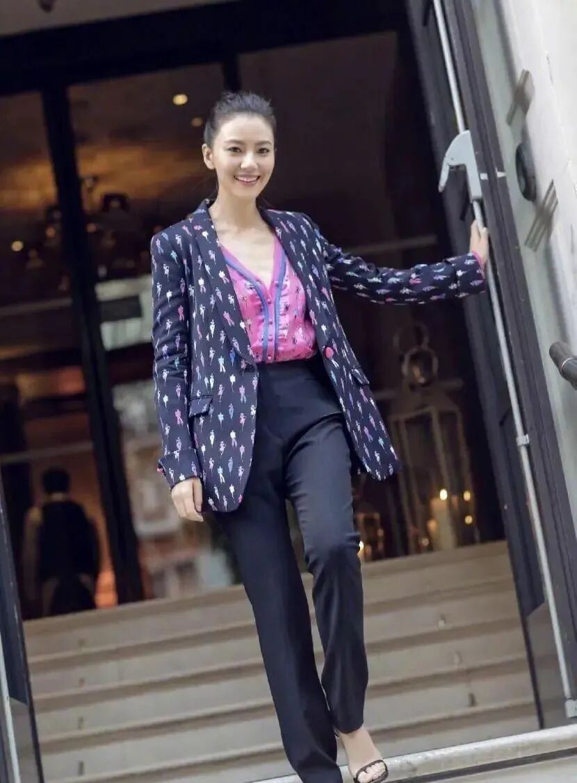 高圆圆这身西装外套花纹特别,打底衫配色也很亮眼,最抢眼的是领口开得超大,一不小心就会露太多。