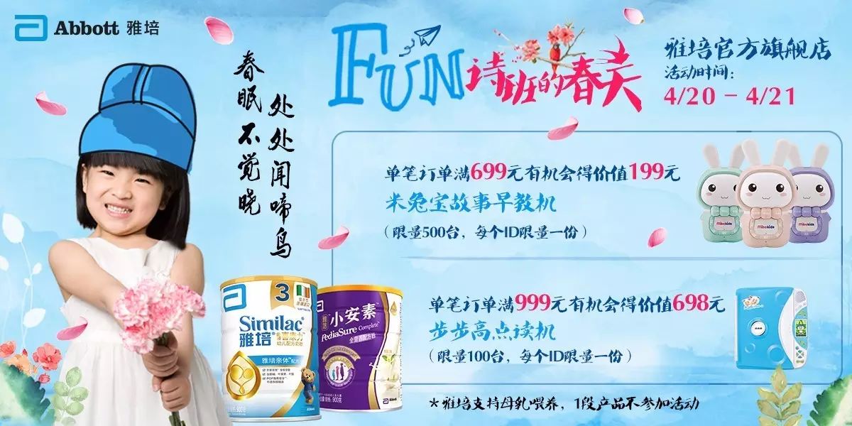 父母的陪伴、应季的风景,以诗歌启蒙孩子认知世界。不知不觉中,萌娃收获诗词底蕴,同时掌握正确的学习方式,“腹有诗书气自华”这样的希冀自然能够达成。而雅培此次与天猫携手打造420喵妈爱宝日-雅培Fun诗班的春天,不仅为萌娃们秀才情提供绝佳“舞台”,更为新手奶爸辣妈们带来诱人好礼!