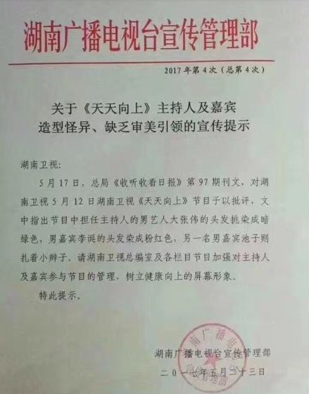 文件中称《天天向上》5月12日播出的节目中,大张伟的绿色头发、嘉宾李诞的红色头发等不利于树立健康向上的形象,在随后播出的节目中大张伟的头发已经被《天天向上》后期P成黑色。
