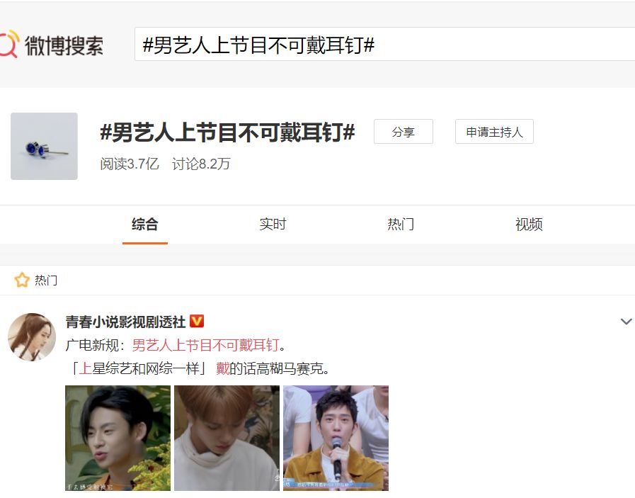 1月16日,“男艺人上节目不可戴耳钉”位列微博热搜榜单第一名。原来,微博博主“青春小说影视剧透社”发文称:“广电新规:男艺人上节目不可戴耳钉。上星综艺和网综一样,戴的话高糊马赛克。”