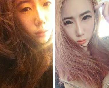 这个妹子上妆后是这样的:大眼睛、高鼻梁、白皮肤