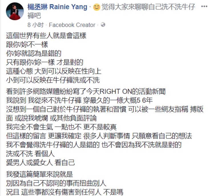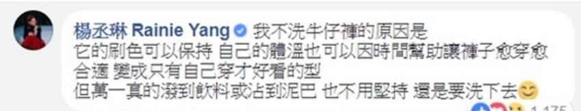 杨丞琳进一步解释:我不洗牛仔裤的原因是,它的刷色可以保持,自己的体温也可以因时间帮助,让裤子愈穿愈合适,变成只有自己穿才好看的型。